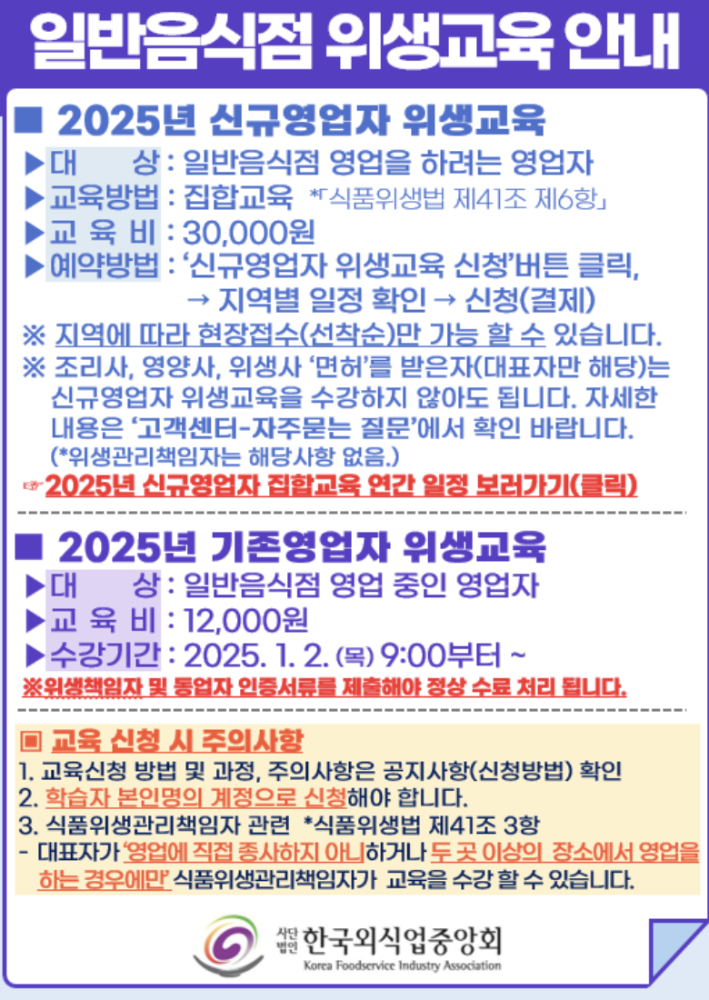 한국외식업중앙회 온라인 위생교육은 신규 및 기존 영업자를 대상으로 집합 교육과 온라인 교육을 제공하여 음식점의 위생 관리 능력을 향상시키고 법정 교육 요건을 충족시킬 수 있도록 지원합니다. 본 글에서는 한국외식업중앙회 온라인 위생교육의 신청 방법, 교육 과정, 주의사항 및 환불 기준 등에 대해 자세히 안내드립니다. 목차서론한국외식업중앙회 온라인 위생교육 소개온라인 위생교육 신청 방법신규영업자 집합 위생교육 신청기존영업자 온라인 위생교육 신청위생교육 주의사항수강 기간 및 환불 기준결론서론외식업을 운영하거나 새롭게 창업을 준비 중인 영업자에게 있어 위생 관리는 매우 중요한 요소입니다. 한국외식업중앙회는 이러한 영업자들을 위해 온라인 위생교육을 제공하여, 법정 교육 요건을 충족하고 안전한 음식점을 운영할 수 ..