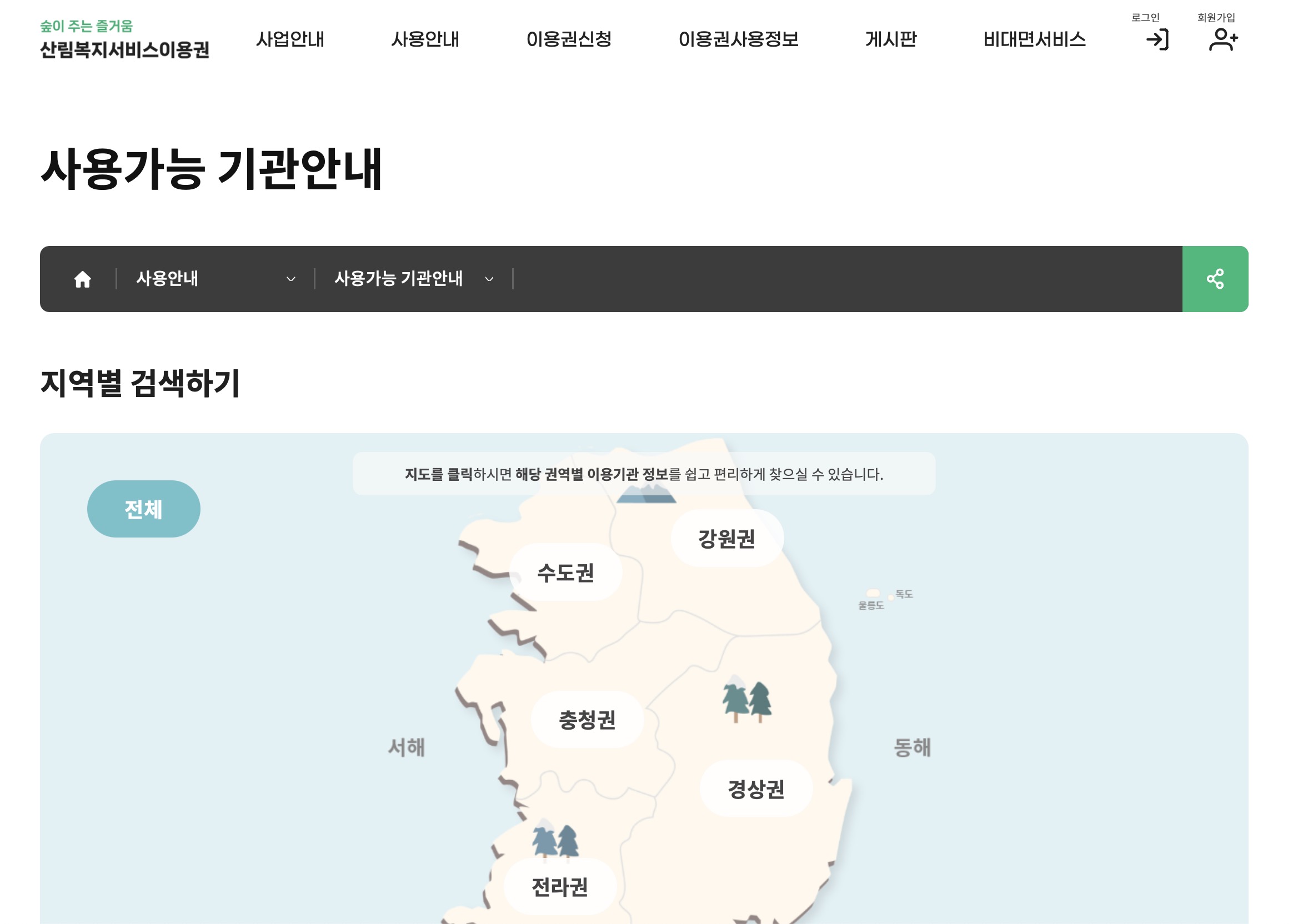 - 사용 가능 시설 조회: 산림복지서비스이용권 사용 시설 안내